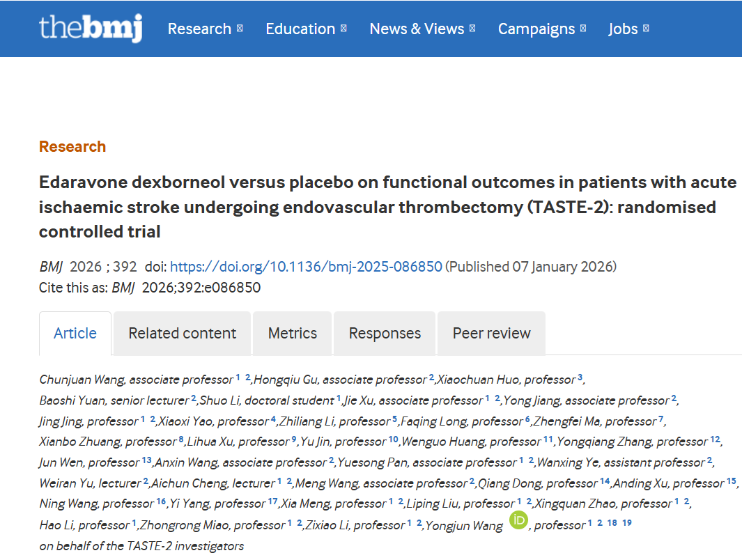 王拥军院士团队TASTE-2研究登上《英国医学杂志》脑细胞保护剂联合取栓显著降低致残